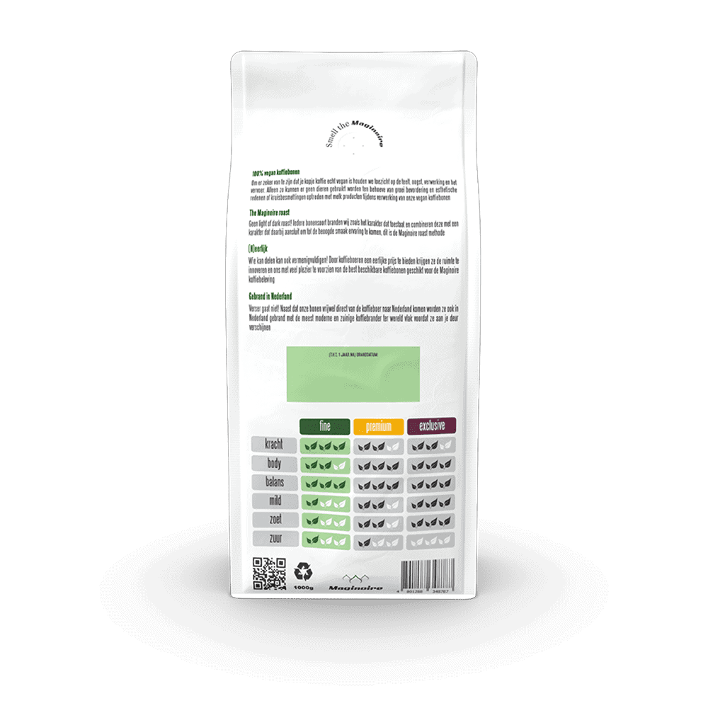 Wat maakt deze Fine melange anders? Naast de uitzonderlijke kwaliteit van bonen door omgevingsinvloeden, verbouw wijzen en de daarbij gebruikte natuurlijke producten komen alleen met de hand gesorteerde volmaakte bonen in de stijlvolle Maginoire verpakking terecht. Daarnaast maakt het unieke brandproces een harmonieuze samenstelling van licht fruitige ondertonen uit Azië, een delicate aardse verbinding met Afrikaanse bonen en nootachtige aroma’s van het uitgesproken karakter van lekkere koffiebonen uit Zuid-Amerika. Een ander voordeel van deze Fine melange is de veelzijdigheid. Of je nu een espresso liefhebber bent, een filterkoffie verkiest of de voorkeur geeft aan een French press deze koffiebonen passen naadloos bij bereiding met zowel half- als volautomatische koffiemachines zonder het verlies van karakter of balans. Bovendien is de Fine melange niet alleen een traktatie voor je emoties maar ook voor je gemoedsrust. Net als onze andere koffiebonen is deze melange 100% vegan namelijk! Daarbij komt dat we streven naar een volmaakt duurzaam en ethisch verantwoord product zonder gebruik te maken van dieren. Op deze wijze kun jij met een gerust hart genieten van lekkere koffiebonen en bijdragen aan een betere wereld.